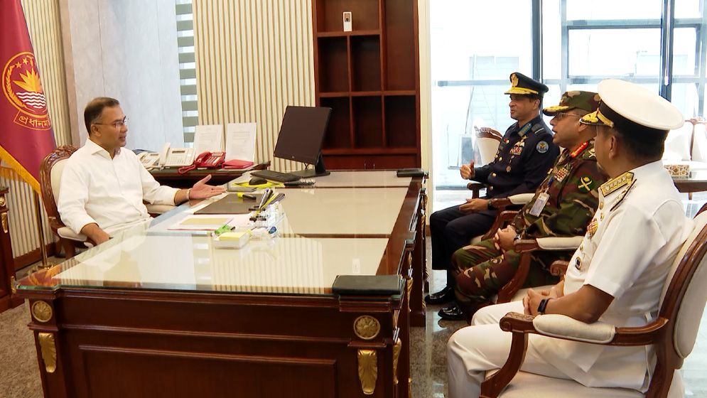 বৃহস্পতিবার (১৯ ফেব্রুয়ারি) সকালে তিনি তিন বাহিনী প্রধানের সঙ্গে বৈঠক করেন। উপস্থিত ছিলেন সেনাপ্রধান জেনারেল ওয়াকার-উজ-জামান, এয়ার চিফ মার্শাল হাসান মাহমুদ খাঁন, ও নৌবাহিনী প্রধান ভাইস অ্যাডমিরাল মোহাম্মদ নাজমুল হাসান।